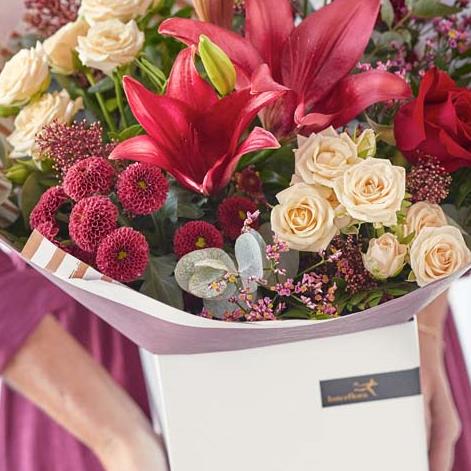 A gorgeous bouquet crafted by their local florist, featuring blooms in rich red and green shades, with peach and cream highlights and pops of burgundy and cerise.
