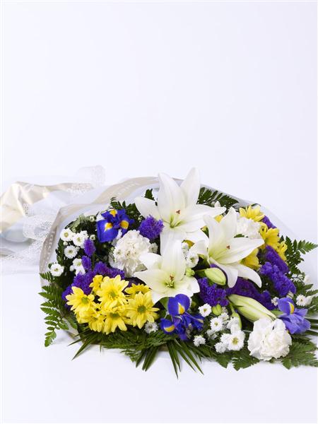 This sheaf of fresh flowers is simply arranged and presented wrapped and tied with a ribbon. The selection includes cream Asiatic Lily, blue iris, white carnations, yellow spray chrysanthemums, white September flowers and blue statice, hand-tied with leather leaf and palm leaves.