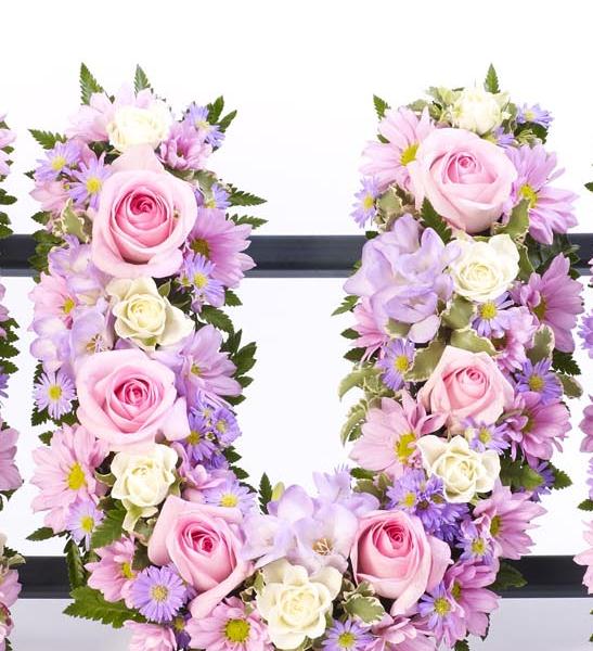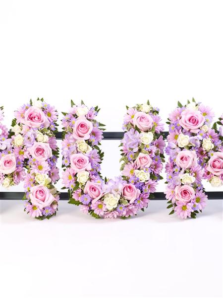 A mass of spray chrysanthemums, freesias, roses, spray roses and September flower in white, lilac and pink is used to create this Mum tribute.