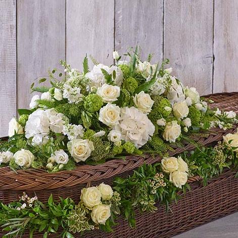 An elegant combination of our White Casket Spray, featuring the finest roses, stocks and hydrangeas, with a lush rose and foliage garland dotted with dainty waxflower.